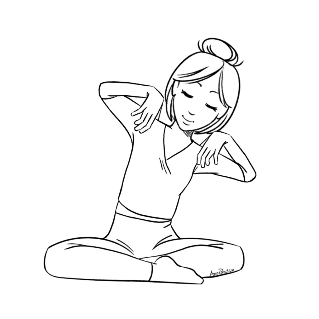 Postura y Mudra: siéntate en Postura Fácil (Sukhasana) y tómate de los hombros con los dedos hacia delante y los pulgares hacia atrás, manteniendo la parte superior de los brazos paralela al suelo.