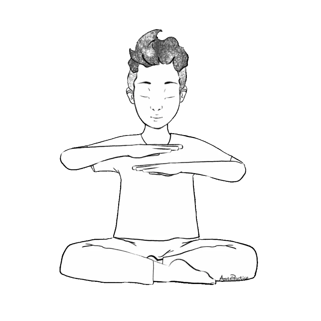 Posture et mudra : Asseyez-vous en posture facile (Sukhasana), le dos droit. Placez vos paumes vers le bas, la main droite 2 à 5 cm au-dessus de la gauche, au niveau du chakra du cœur (Anahata Chakra). Gardez vos avant-bras parallèles au sol.