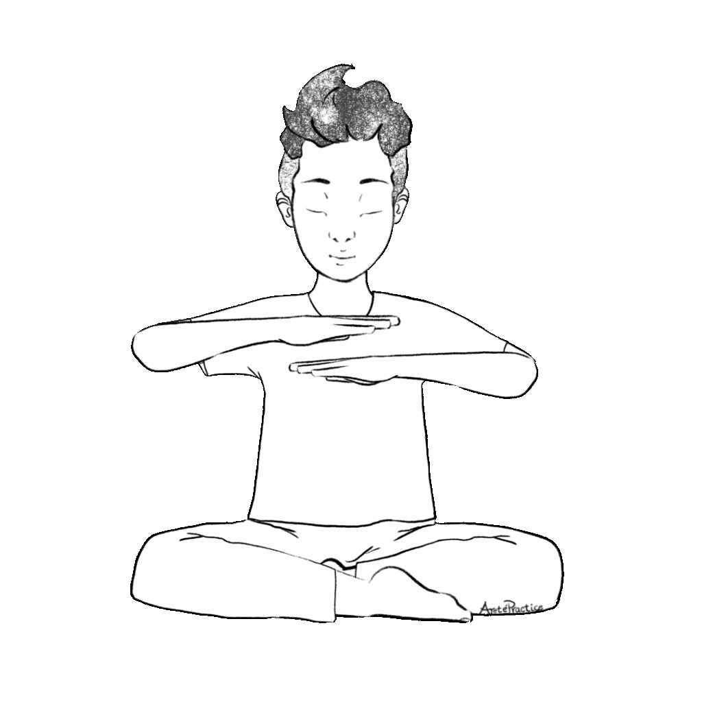Postura e Mudra: Sente-se na Postura Fácil (Sukhasana) com a coluna reta. Mantenha as palmas das mãos voltadas para baixo, com a mão direita 2,5 a 5 cm acima da esquerda, no centro do coração (chakra Anahata). Mantenha os antebraços paralelos ao chão.